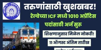 रेल्वेत नोकरीची सुवर्णसंधी : ICF मध्ये १०१० अप्रेंटिस पदांसाठी मेगा भरती...