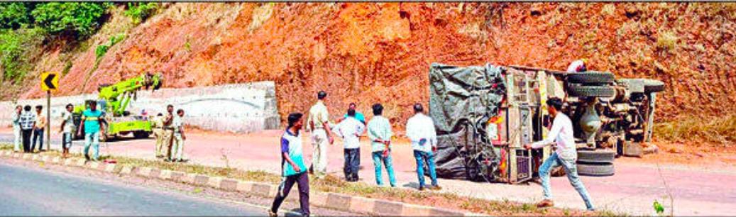 भरधाव वेगात असलेला हा ट्रक रस्त्याच्या कडेला असलेल्या सुरक्षा भिंतीला आणि दिशादर्शक फलकाला जोरदार धडकला. धडक इतकी भीषण होती की ट्रक महामार्गाच्या मध्यभागीच पलटी झाला.