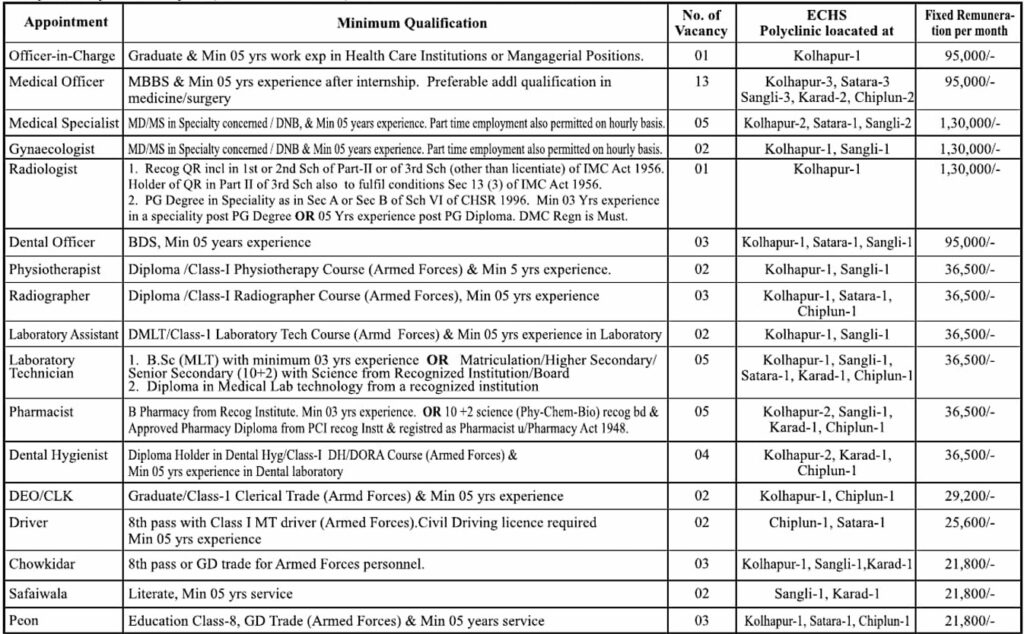 निवड झालेल्या उमेदवारांची नियुक्ती कोल्हापूर, सांगली, सातारा, कराड आणि चिपळूण येथील ECHS पॉलिक्लिनिक्समध्ये केली जाईल.