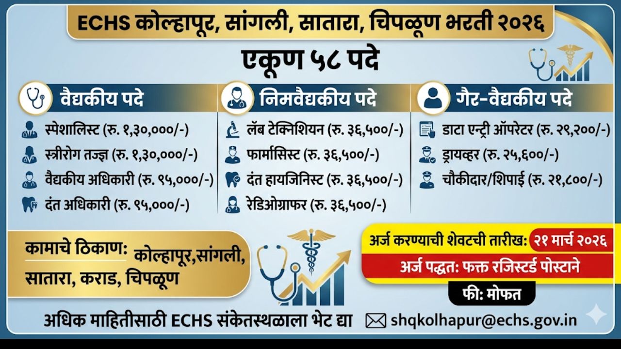 माजी सैनिक अंशदायी आरोग्य योजना (ECHS) अंतर्गत कोल्हापूर स्टेशन मुख्यालय अंतर्गत येणाऱ्या विविध पॉलिक्लिनिक्ससाठी मोठी भरती जाहीर झाली आहे. कोल्हापूर, सांगली, सातारा, कराड आणि चिपळूण येथील केंद्रांवर वैद्यकीय, निमवैद्यकीय आणि गैर-वैद्यकीय अशा एकूण ५८ पदांसाठी अर्ज मागवण्यात आले आहेत. ही पदे कंत्राटी तत्त्वावर भरली जाणार असून, पात्र उमेदवारांना २१ मार्च २०२६ पर्यंत अर्ज करता येणार आहे.