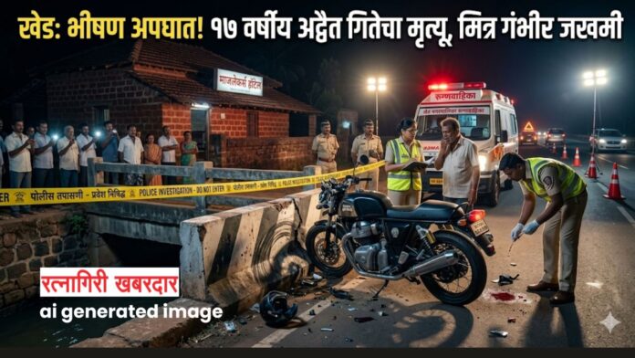 रत्नागिरी (प्रतिनिधी): रत्नागिरी जिल्ह्यातील खेड तालुक्यात मुंबई-गोवा राष्ट्रीय महामार्गावर एक भीषण रस्ता अपघात झाला आहे. माजलेकर्स हॉटेलजवळील मोरीजवळ भरधाव वेगाने जाणारी ‘रॉयल एनफिल्ड’ दुचाकी नियंत्रणाबाहेर गेल्याने झालेल्या या अपघातात एका १७ वर्षीय अल्पवयीन मुलाला आपला जीव गमवावा लागला आहे. तर त्याच्यासोबत असलेला त्याचा मित्र या अपघातात गंभीर जखमी झाला आहे.