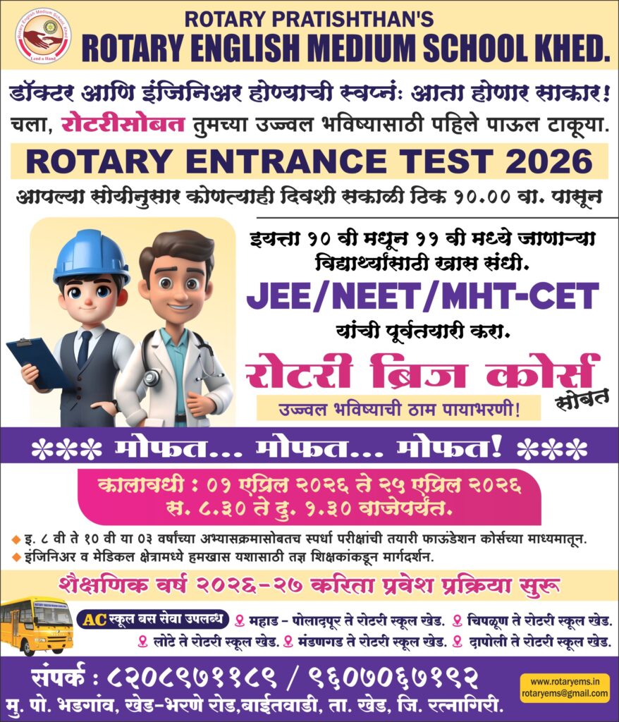 खेड (प्रतिनिधी): मुंबई विज्ञान शिक्षक असोसिएशनच्या वतीने आयोजित मानाच्या ‘डॉ. होमी भाभा बालवैज्ञानिक’ स्पर्धेत खेड येथील रोटरी स्कूलच्या विद्यार्थ्यांनी सुवर्ण अक्षरात नाव कोरले आहे. इयत्ता सहावीतील कु. पूर्वी सूर्यवंशी, कु. अथर्व हलगवार आणि कु. अर्णव घुंबरे या तिन्ही विद्यार्थ्यांनी तृतीय पातळीच्या अंतिम टप्प्यात देदीप्यमान यश संपादन करत ‘रौप्य पदक’ पटकावले आहे. या तिघांनाही मानाचा ‘बालवैज्ञानिक’ हा किताब देऊन गौरविण्यात आले आहे.