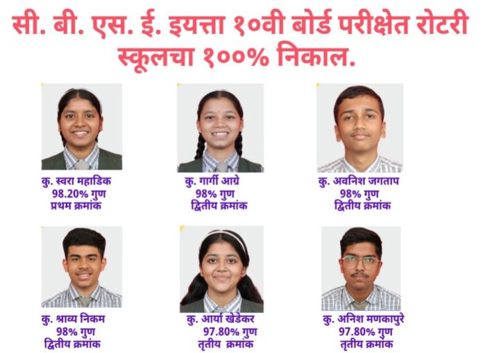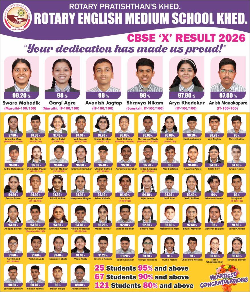 शैक्षणिक वर्ष 2025-26 मधील सी. बी. एस. ई. इयत्ता 10 वीचा परीक्षेचा निकाल नुकताच जाहीर झाला. या परीक्षेत रोटरी इंग्लिश मिडिअम स्कूल खेडच्या विद्यार्थ्यांनी 100 टक्के निकालाची परंपरा कायम राखत दैदिप्यमान सुयश प्राप्त केले.
