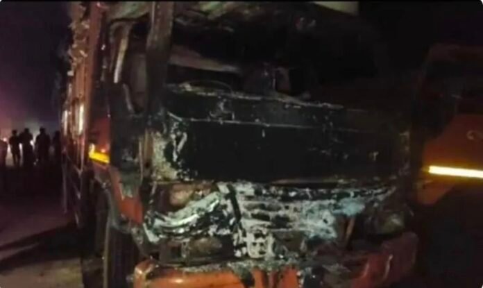 याप्रकरणी दोन अज्ञात तरुणांवर बुधवारी येथील पोलिस ठाण्यात गुन्हा दाखल करण्यात आला आहे. याची फिर्याद ट्रकचालक रमाकांत धनेश्वर यादव (रा. कळंबस्ते फाटा, चिपळूण) यांनी दिली आहे. यादव हे ट्रकमधून शृंगारतळी येथील कल्लन भंगारवाले यांचा पुड्डा घेऊन खेर्डी एमआयडीसीत जात होते. याचवेळी ट्रक उमरोली येथे आला असता मागून दुचाकीने जोरदार धडक दिली. यामध्ये दुचाकी ट्रकच्या मागील चाकाखाली जाऊन एक तरुण गंभीर जखमी झाला व तिथेच त्याचा मृत्यू झाला. या घटनेनंतर तेथे मोठी गर्दी झाली. या गर्दीतील दोन तरुणांनी रागाच्या भरात ट्रकला आग लावली. त्यामध्ये ट्रकची केबीन व दर्शनी भाग जळून खाक झाला. यामध्ये ट्रकचे दोन लाखांहून अधिक नुकसान झाले. याप्रकरणी दोन अज्ञातांविरोधात गुन्हा दाखल झाला आहे.