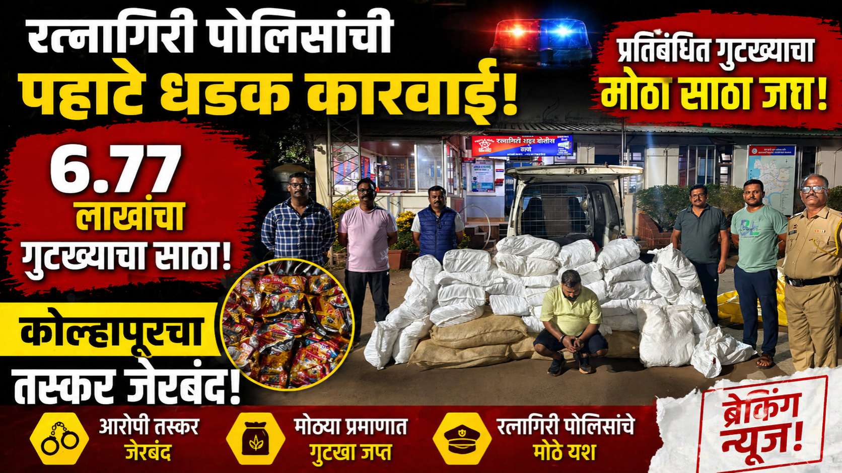 रत्नागिरी: रत्नागिरी शहरात प्रतिबंधित गुटखा आणि पान मसाल्याची तस्करी करणाऱ्यांविरुद्ध शहर पोलिसांनी मोठी कारवाई केली आहे. कोल्हापूरहून रत्नागिरीत विक्रीसाठी आणलेला तब्बल ३ लाख २७ हजार ९०४ रुपयांचा प्रतिबंधित साठा आणि वाहतुकीसाठी वापरलेले वाहन असा एकूण ६ लाख ७७ हजार ९०४ रुपयांचा मुद्देमाल पोलिसांनी जप्त केला आहे. या कारवाईमुळे अवैध गुटखा विक्रेत्यांचे धाबे दणाणले आहेत.