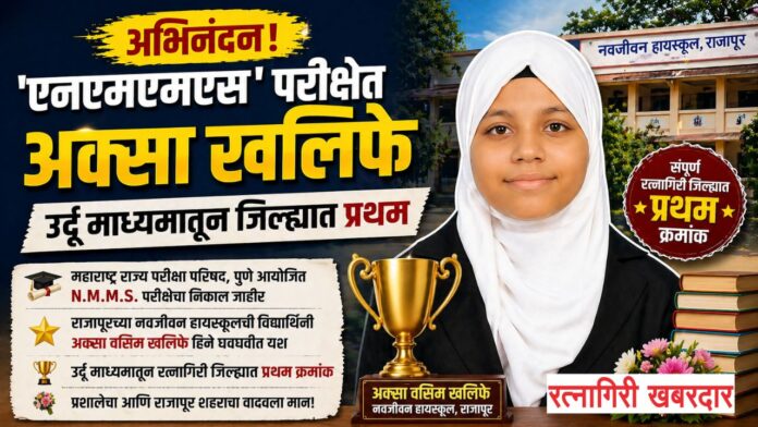 रत्नागिरी (राजापूर): महाराष्ट्र राज्य परीक्षा परिषद, पुणे यांच्या वतीने घेण्यात आलेल्या ‘नॅशनल मीन्स कम मेरिट स्कॉलरशिप’ (N.M.M.S.) परीक्षेचा निकाल नुकताच जाहीर झाला. या परीक्षेत राजापूर येथील नवजीवन हायस्कूलची विद्यार्थिनी कुमारी अक्सा वसिम खलिफे हिने नेत्रदीपक यश संपादन केले आहे. अक्साने उर्दू माध्यमातून संपूर्ण रत्नागिरी जिल्ह्यातून प्रथम क्रमांक पटकावून आपल्या प्रशालेचा आणि राजापूर शहराचा नावलौकिक वाढवला आहे.