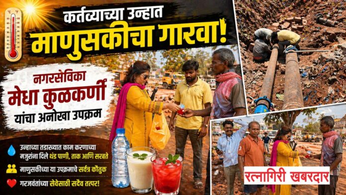 रत्नागिरी: रत्नागिरी शहरात सध्या उन्हाचा पारा चढलेला असतानाच, विविध विकासकामांसाठी कर्मचारी भररस्त्यात घाम गाळत आहेत. अशा कडक उन्हात आपले कर्तव्य बजावणाऱ्या कर्मचाऱ्यांप्रती संवेदनशीलता दाखवत नगरसेविका सौ. मेधा कुळकर्णी यांनी माणुसकीचा एक सुंदर आदर्श घालून दिला आहे.