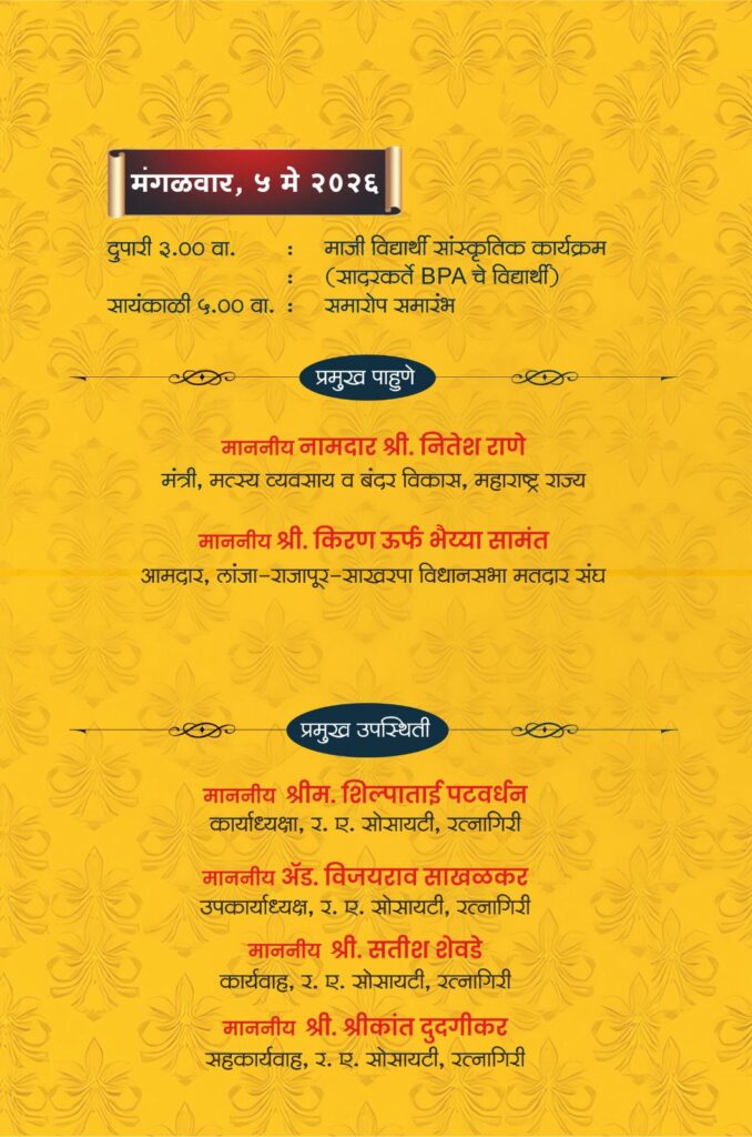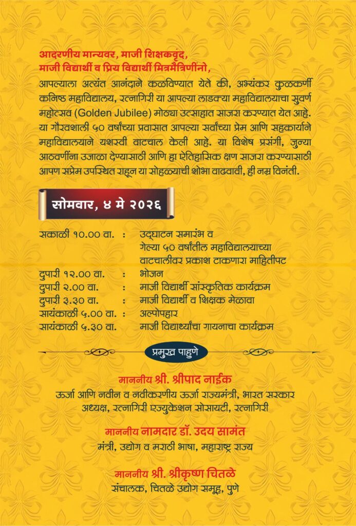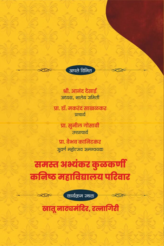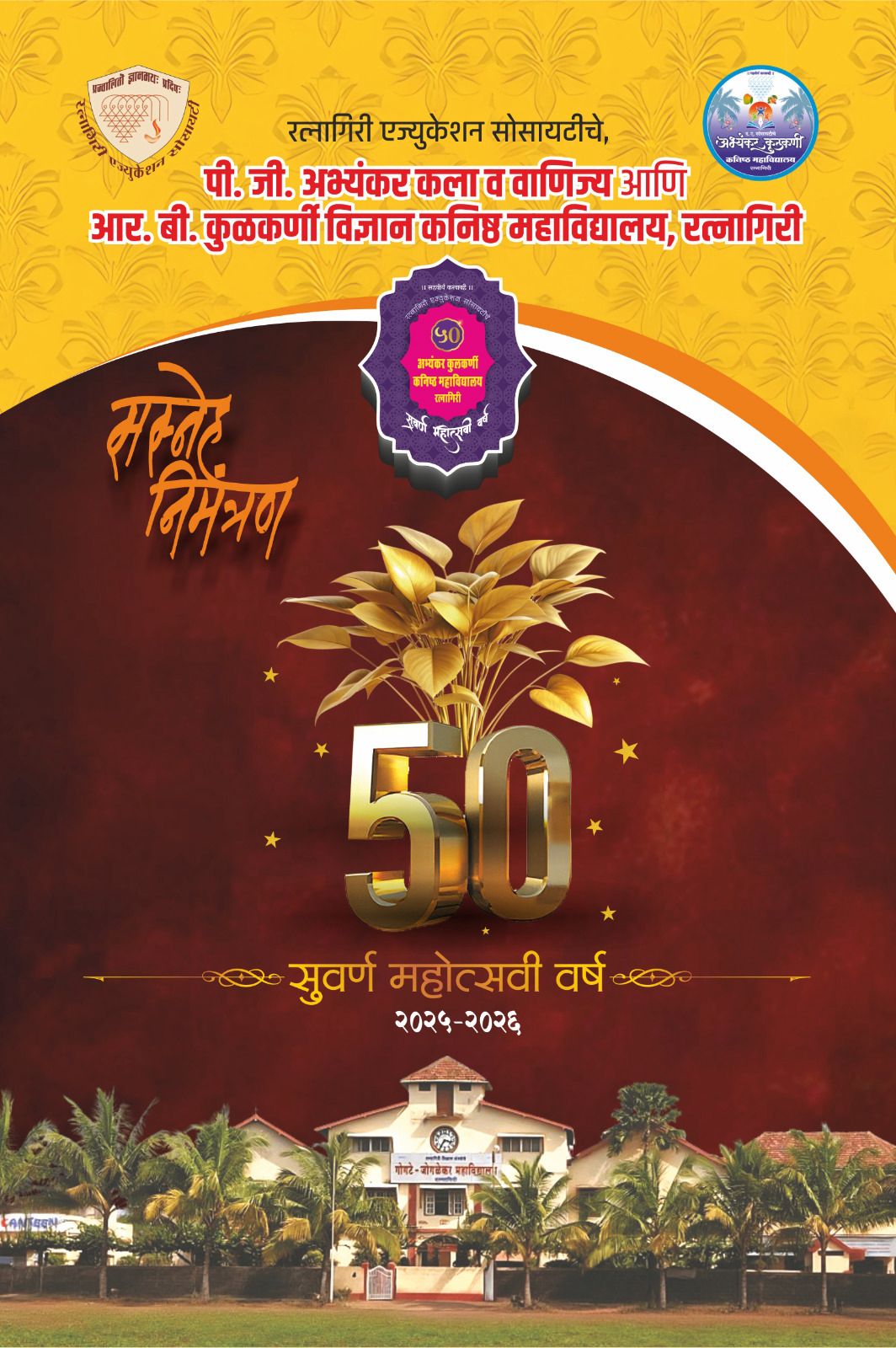 रत्नागिरी : रत्नागिरी एज्युकेशन सोसायटीच्या अभ्यंकर-कुळकर्णी कनिष्ठ महाविद्यालयाचा सुवर्णमहोत्सव साजरा होत आहे. याचा सांगता सोहळा येत्या ४ व ५ मे रोजी खातू नाट्यमंदिरात आयोजित केला आहे. या कार्यक्रमाला माजी विद्यार्थ्यांनी आवर्जून उपस्थित राहावे, असे आवाहन संस्थेतर्फे कार्याध्यक्ष, उपकार्याध्यक्ष, उपाध्यक्ष, कार्यवाह, सहकार्यवाह, विश्वस्त मंडळ, सल्लागार आणि नियामक मंडळाचे सदस्य, प्राचार्य यांनी केले आहे. सांगता सोहळ्याची जय्यत तयारी महाविद्यालयात सुरू आहे.
