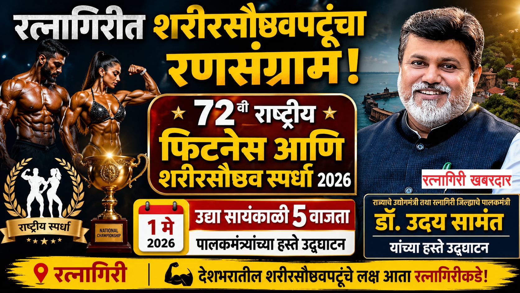 रत्नागिरी: रत्नागिरी शहरात शरीरसौष्ठव क्षेत्रातील मानाची आणि अत्यंत प्रतिष्ठेची अशी ‘७२ वी राष्ट्रीय फिटनेस आणि शरीरसौष्ठव स्पर्धा २०२६’ आयोजित करण्यात आली आहे. या भव्य स्पर्धेचे उद्घाटन राज्याचे उद्योगमंत्री तथा रत्नागिरी जिल्ह्याचे पालकमंत्री डॉ. उदय सामंत यांच्या हस्ते १ मे रोजी सायंकाळी ५ वाजता होणार आहे. उदय सामंत प्रतिष्ठानच्या वतीने प्रायोजित असलेल्या या स्पर्धेमुळे संपूर्ण देशातील शरीरसौष्ठवपटूंचे लक्ष आता रत्नागिरीकडे लागले आहे.