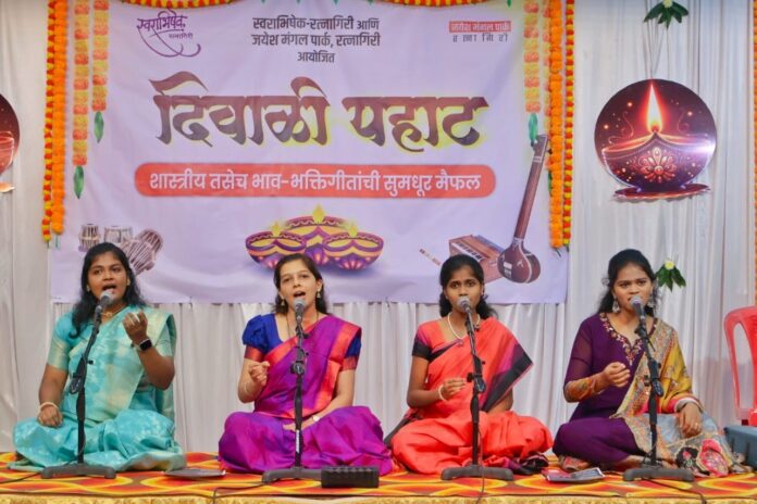 रत्नागिरी : स्वराभिषेक आणि जयेश मंगल पार्क यांच्या संयुक्त विद्यमाने आयोजित दिवाळी पहाट मैफल उत्तरोत्तर रंगत गेली. स्वराभिषेक संगीत वर्गाच्या विद्यार्थ्यांनी या मैफलीत शास्त्रीय संगीताबरोबरच एकापेक्षा एक सुगम गीते सादर करून रसिकजनांना मंत्रमुग्ध केले.
