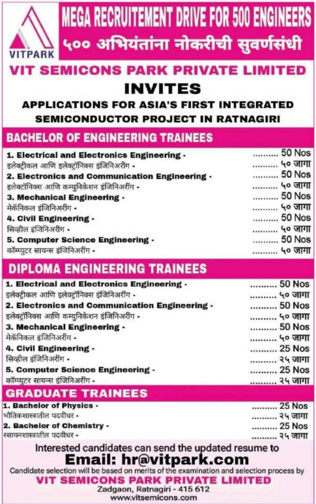 व्हीआयटी सेमिकॉन्स पार्क प्रायव्हेट लिमिटेड या कंपनीकडून नोकर भरतीची जाहिरात स्थानिक वृत्तपत्रातून प्रसिद्ध करण्यात आली आहे. इच्छुक उमेदवारांनी hr@vitpark.com या मेल वर आपला अर्ज दाखल करावा असे या जाहिरातीच्या माध्यमातून कळविण्यात आले आहे. वृत्तपत्रात आलेली ही जाहिरात खाली प्रसिद्ध करण्यात आली आहे.