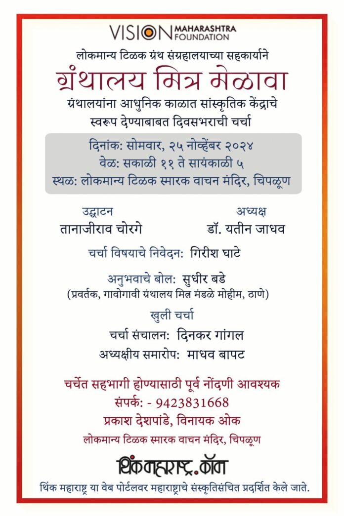चिपळूण : ग्रंथव्यवहार नवनवीन तंत्रसुविधांमुळे अडचणीत आहे. त्याचा परिणाम ग्रंथालयांवर होत आहे. ग्रंथालयांचा लोकाश्रय कमी होत आहे. या परिस्थितीत काय करावे, ग्रंथालयांना काही नवे रूप धारण करता येईल का, अशा विविध अंगांनी उपाययोजनेचा विचार करण्याकरता सोमवारी, दि. २५ नोव्हेंबर रोजी चिपळूणच्या लोकमान्य टिळक स्मारक वाचन मंदिरात सकाळी ११ ते सायंकाळी ५ या वेळेत ‘ग्रंथालय मित्र’ मेळावा आयोजित करण्यात आला आहे.