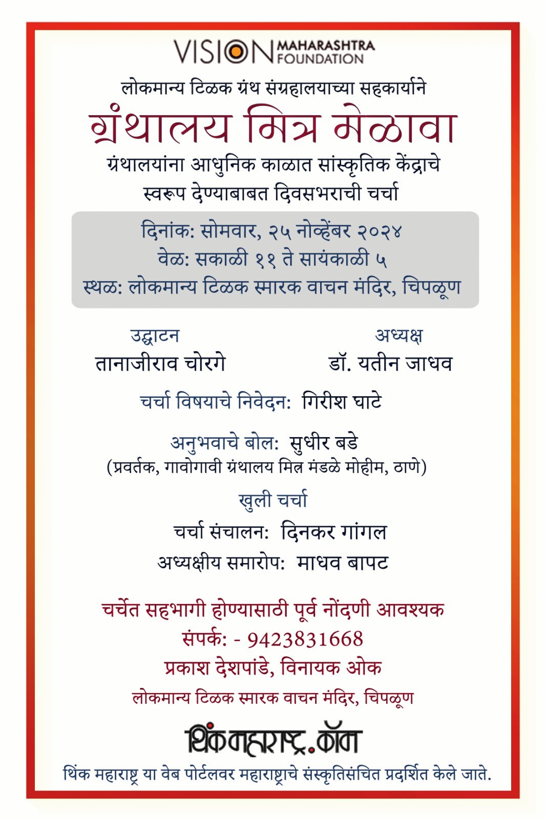 याच तऱ्हेचे मेळावे येत्या काही महिन्यांत दक्षिण कोकण, गोवा, मराठवाडा, खानदेश, विदर्भ, पश्चिम महाराष्ट्र अशा वेगवेगळ्या भागांत घेण्याचे नियोजन आहे. चिपळूणला होणाऱ्या दिवसभराच्या या चर्चासत्रात ग्रंथप्रेमी आणि वाचकांनी सहभागी व्हावे असे आवाहन प्रकाश देशपांडे, विनायक ओक (लोकमान्य टिळक स्मारक वाचन मंदिर चिपळूण) आणि सुधीर बडे (प्रवर्तक, गावोगावी ग्रंथालय मित्र मंडळे मोहीम, ठाणे) यांनी केले आहे. अधिक माहितीसाठी 9423831668 या क्रमांकावर संपर्क साधावा.