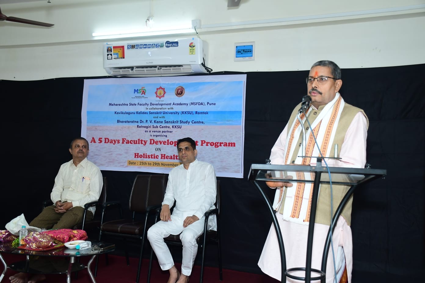 कार्यक्रमाचे प्रास्ताविक उपकेंद्राचे संचालक डॉ. दिनकर मराठे यांनी केले. याप्रसंगी रत्नागिरीतील सुपरिचित वैद्य मंदार भिडे यांनी आपल्या अमोघ वाणीतून आयुर्वेद, दिनचर्या आणि स्वास्थ्य यावर विस्तृत प्रकाश टाकला. अध्यक्षीय भाषणात प्रो. त्रिपाठी म्हणाले की, आपल्या शास्त्रात विविध विषयांचे अमूल्य ज्ञान आहे. केवळ त्याची अंमलबजावणी आपल्या आयुष्यात करणे आवश्यक आहे. आरोग्य चांगले ठेवायचे असेल तर नियमपालन करणे आवश्यक आहे.