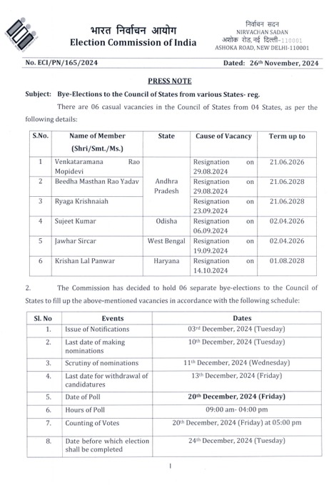 नवी दिल्ली : भारतीय निवडणूक आयोगाने राज्यसभेच्या सहा जागांसाठी निवडणुकीची अधिसूचना जारी केली आहे. २० डिसेंबर रोजी निवडणूक होणार आहे. त्याच दिवशी निकालही जाहीर होणार आहेत. आंध्र प्रदेशात तीन आणि ओडिशा, हरयाणा आणि पश्चिम बंगालमधील प्रत्येकी एका जागेवर निवडणूक होणार आहे.