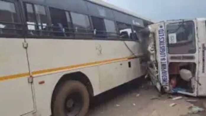 MIDC मधून शिफ्ट संपवून कर्मचाऱ्यांना घरी नेणाऱ्या बसवर, कंटेनर पलटी झाल्यामुळे कर्मचारी जखमी झाले आहेत. या अपघातानंतर घाटात वाहतुकीचा खोळंबा झाला आहे.
