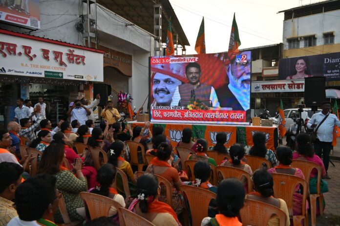 रत्नागिरी : विधानसभा निवडणुकीत विरोधकांचा सुफडा साफ करून भाजपा महायुतीने प्रचंड बहुमत मिळवले. या यशाचे शिल्पकार, लाडके मुख्यमंत्री म्हणून देवेंद्र फडणवीस यांनी गुरुवारी मुंबईतील आझाद मैदानावर आयोजित रंगारंग कार्यक्रमात मुख्यमंत्रीपदाची शपथ घेतली. हा सोहळा मारुती मंदिर येथे भाजपाच्या माजी नगरसेवकांनी भव्य स्क्रिनवर प्रक्षेपित केला.