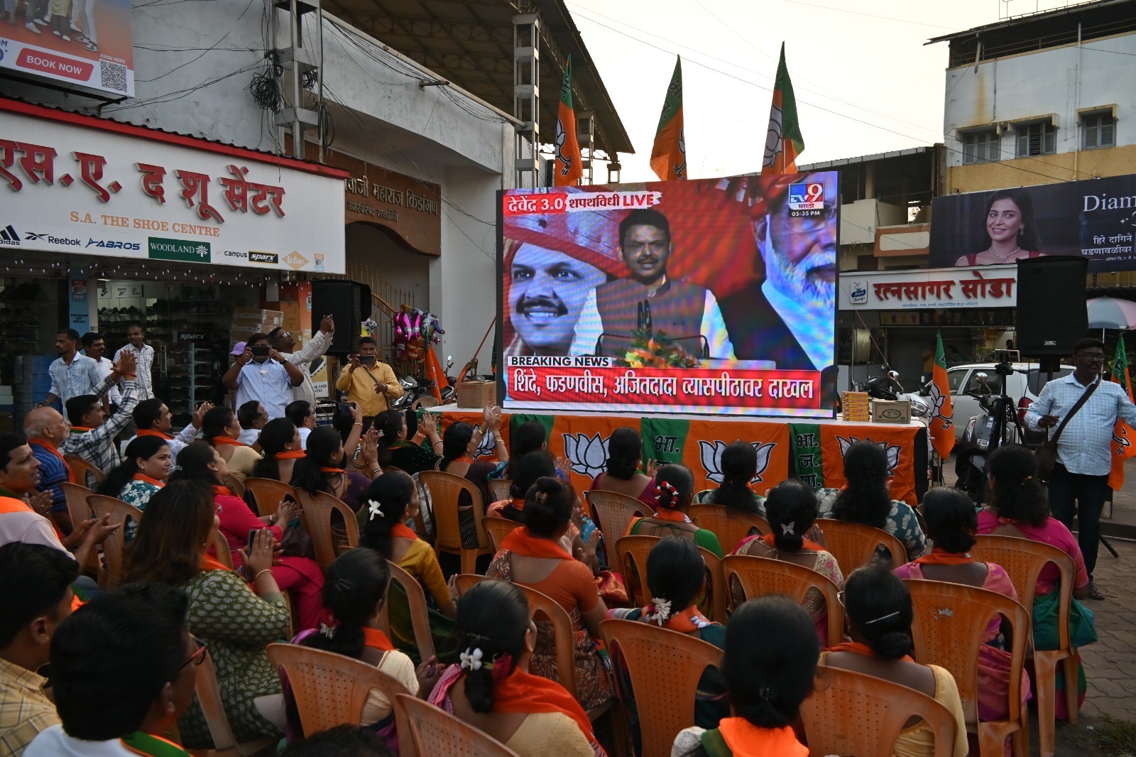 संध्याकाळी ५ वाजल्यापासून मारुती मंदिर येथे ढोल-ताशांचा गजर करण्यात येत होता. मी पुन्हा आलोच… हा देवेंद्र फडणवीस यांचा लावलेला बॅनर लक्ष्यवेधी ठरला. एकंदरित भाजपच्या जल्लोषी कार्यक्रमाचे सुरेख आयोजन करण्यात आले. हजारो लोकांना येथे लाडू वाटप करण्यात येत होते.