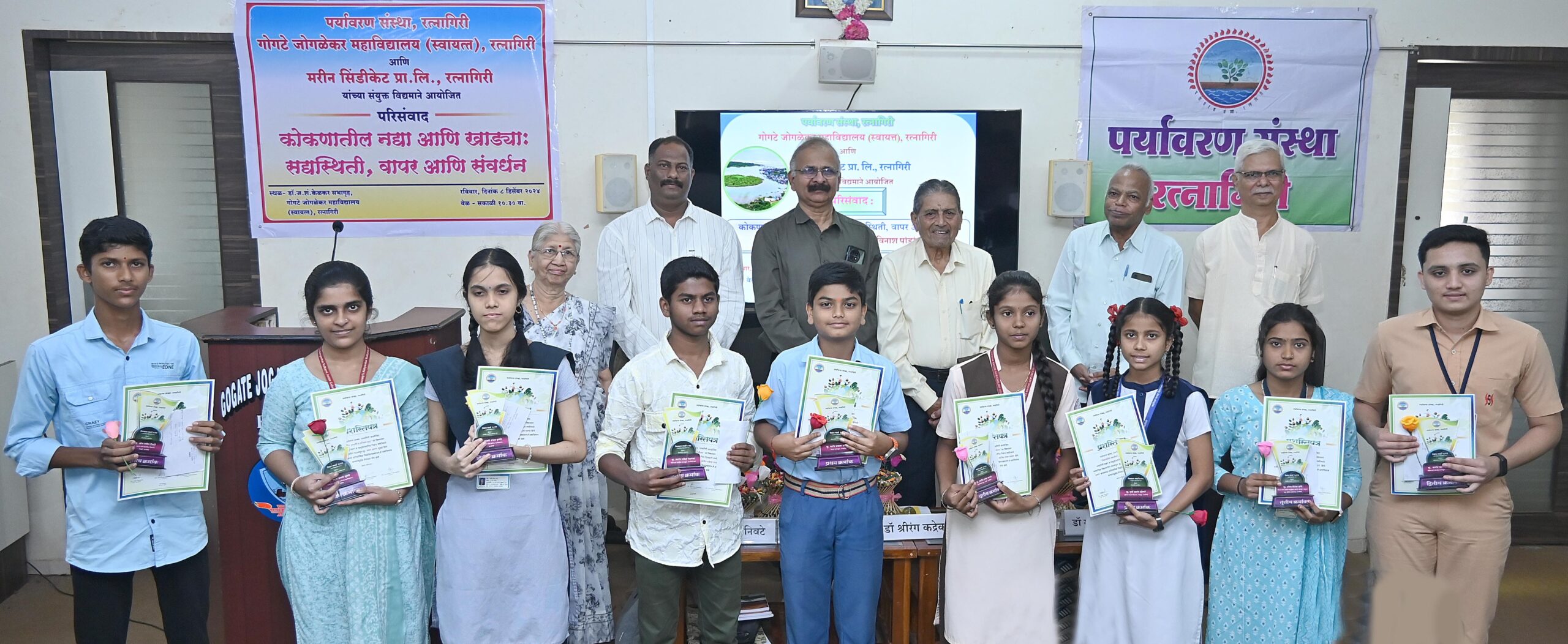मान्यवरांच्या हस्ते कुंडीतील रोपट्याला पाणी घालून समारंभाला प्रारंभ झाला. प्रमुख पाहुणे डॉ. सुमंत पांडे, डॉ. श्रीनिवास वडगबालकर, पर्यावरण संस्थेचे संस्थापक व माजी कुलगुरू डॉ. श्रीरंग कद्रेकर, संस्थाध्यक्ष व गोगटे महाविद्यालयाचे प्रशासकीय उपप्राचार्य डॉ. सुरेंद्र ठाकुरदेसाई व्यासपीठावर उपस्थित होते. मरीन सिंडिकेटचे मरीनर दिलीप भाटकर यांनी मान्यवरांचा परिचय करून दिला. मान्यवर व अशोक प्रभुदेसाई, डॉ. शरद प्रभुदेसाई आदींच्या हस्ते बक्षीस वितरण करण्यात आले.