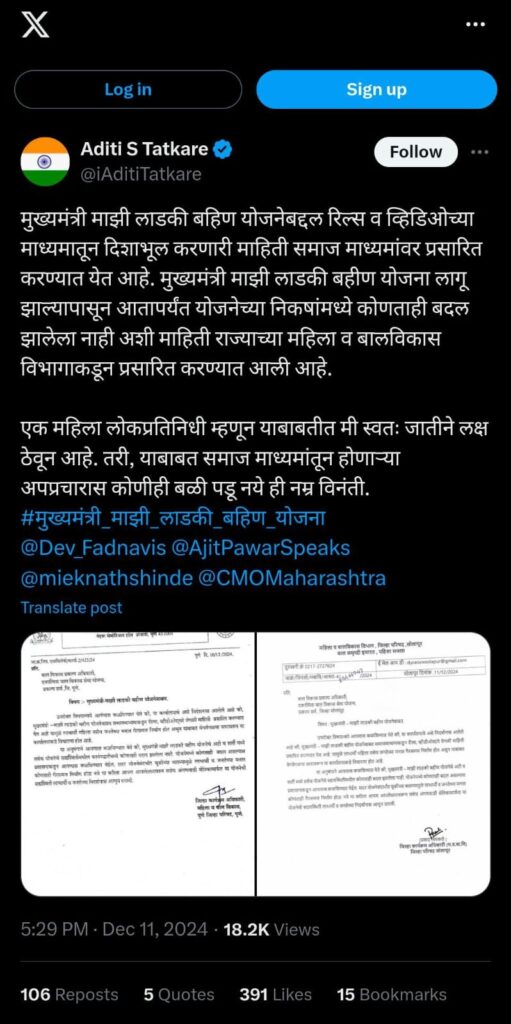 माजी मंत्री व विद्यमान आमदार अदिती तटकरे यांनी सोशल मीडियावर पोस्ट करत स्पष्टीकरण दिले आहे. तटकरे यांनी सांगितले की, मुख्यमंत्री माझी लाडकी बहिण योजनेबद्दल रिल्स व व्हिडिओच्या माध्यमातून दिशाभूल करणारी माहिती समाज माध्यमांवर प्रसारित करण्यात येत आहे.