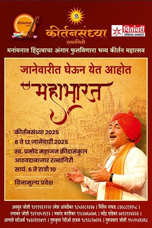 मनामनात हिंदुत्वाचा अंगार फुलवणारा, चैतन्य निर्माण करणारा, राष्ट्रप्रेम जागवणारा, संस्कृती जपणारा, सामाजिक प्रबोधनाचा ध्यास घेतलेला कीर्तनसंध्या महोत्सव येत्या जानेवारी महिन्यात रत्नागिरीत स्व. प्रमोद महाजन क्रीडासंकुलात होणार आहे. महाभारत हा व्यापक विषय राष्ट्रीय कीर्तनकार विद्यावाचस्पती हभप चारुदत्त आफळे बुवा आपल्या नेहमीच्या शैलीत उलगडणार आहेत. पारंपरिक आर्या, साकी, दिंडी यांचा समावेश, तसेच बरोबरीने कथेच्या अनुषंगाने काही निवडक नाट्यगीतांचाही अंतर्भाव त्यात असेल. या कीर्तन महोत्सवासाठी पितांबरी उद्योग समूह यांचे मुख्य प्रायोजकत्व लाभले आहे. महोत्सवाला प्रवेश विनामूल्य असून वृद्ध, ज्यांना खाली मांडी घालून बसता येत नाही अशांसाठी खुर्ची उपलब्ध करून देण्यात येणार आहे. त्यांच्यासाठी देणगी सन्मानिका ठेवण्यात आल्या आहेत. देणगी सन्मानिका कार्यक्रमाला येताना सोबत घेऊन येणे बंधनकारक आहे. देणगी सन्मानिका रत्नागिरीत उपलब्ध असलेली ठिकाणे आणि संपर्क क्रमांक असे –