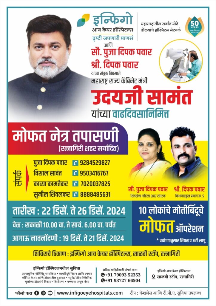 रत्नागिरी : समाज सेवेसाठी नेहमी अग्रेसर असणाऱ्या सौ.पुजाताई पवार, भावी नगरसेविका (शहर संघटक ) आणि दिपक पवार (विभाग प्रमुख) यांच्या आणि इन्फिगो आय केअर हॉस्पिटल यांच्या सौजन्याने याही वर्षी महाराष्ट्र राज्याचे कॅबिनेट मंत्री श्री. उदय सामंत यांच्या वाढदिवसानिमित्त दिनांक २२ डिसें. ते २६ डिसें. पर्यंत मोफत नेत्र तपासणी आणि १० लोकांचे मोतीबिंदूचे मोफत शस्त्रक्रिया इन्फिगो आय केअर हॉस्पिटल, साळवी स्टॉप येथे आयोजित करण्यात आले आहे.