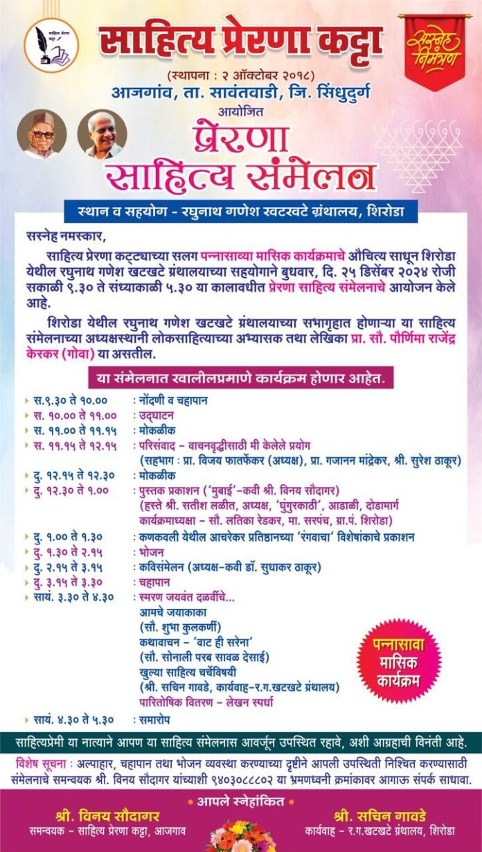 आजगाव येथे ऑक्टोबर २०१८ रोजी स्थापन झालेल्या साहित्य प्रेरणा कट्टा या संस्थेतर्फे स्थापनेपासून दर महिन्याला साहित्यिक कार्यक्रम आयोजित केला जातो. त्यामध्ये पुस्तके, साहित्यिक आणि साहित्यविषयक चर्चा केली जाते. कोकणचे सुपुत्र ज्येष्ठ साहित्यिक जयवंत दळवी यांच्या जन्मशताब्दीच्या निमित्ताने सध्या त्यांच्या साहित्याविषयीची चर्चा दर महिन्याच्या कार्यक्रमात केली जात आहे. या कट्ट्याच्या पन्नासाव्या मासिक कार्यक्रमाचे औचित्य साधून शिरोडा येथील रघुनाथ गणेश खटखटे ग्रंथालयाच्या सहयोगाने येत्या बुधवारी, दि. २५ डिसेंबर रोजी दिवसभराचे प्रेरणा साहित्य संमेलन भरविण्यात येणार आहे. रघुनाथ गणेश खटखटे ग्रंथालयाच्या सहयोगानेच हे संमेलन ग्रंथालयाच्या सभागृहात होणार आहे.