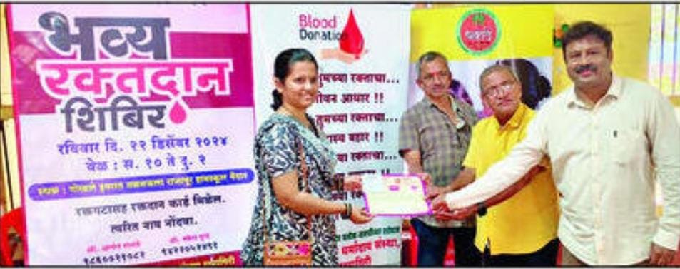या शिबिरात सहा. पोलीस निरीक्षक सुधीर उबाळे, सतिश तिष्ठक, मुख्याधिकारी चेतन विस्पुते, व्यापारी संघाचे अध्यक्ष संदीप मालपेकर, दिनानाथ कोळवणकर, हिंदू जनजागृती समितीचे विनोद गादीकर, महेश मयेकर, अॅड. प्रशांत पाध्ये, डॉ. अभय अळवणी आदींसह सामाजिक क्षेत्रातील कार्यकर्ते, महावितरण, एसटी विभागातील कर्मचारी तसेच महिला, तरुणांनी उपस्थित राहत रक्तदान केले. या रक्तदात्यांना प्रमाणपत्र व सन्मानचिन्ह देऊन गौरविण्यात आले.