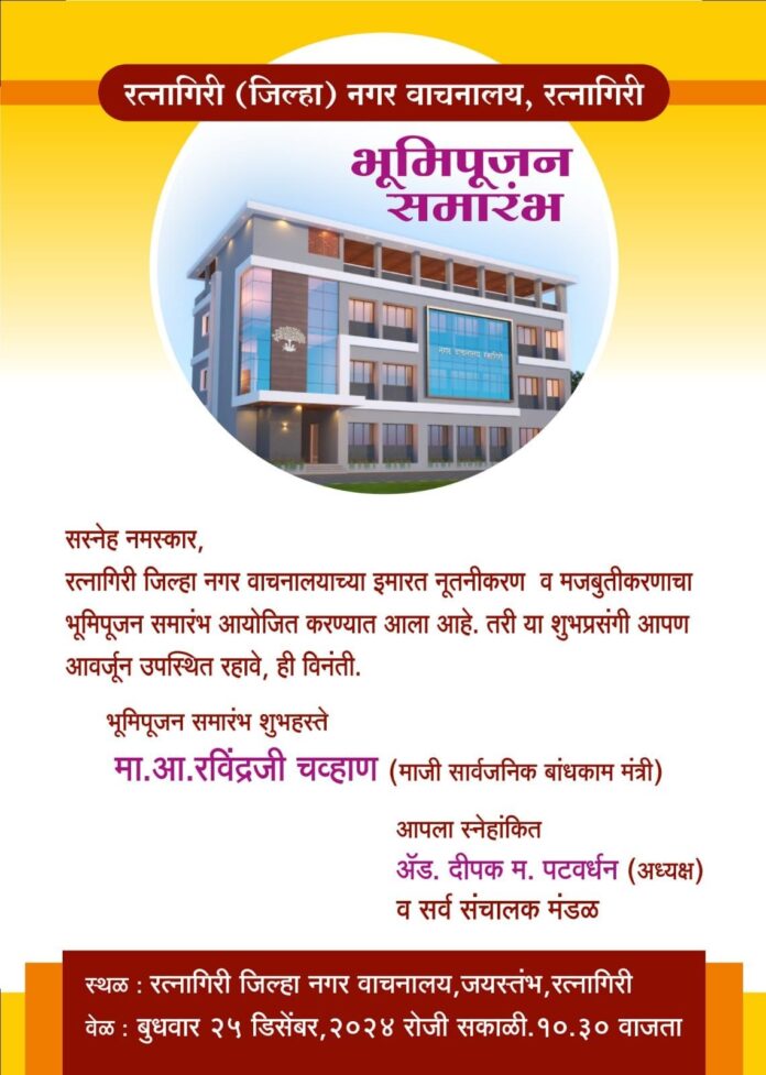 रत्नागिरी : येथील रत्नागिरी (जिल्हा) नगर वाचनालयाच्या नवीन वास्तूचे भूमिपूजन बुधवारी, दि. २५ डिसेंबर सकाळी १०.३० वाजता होणार आहे.