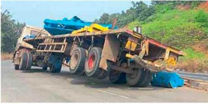खेड : मुंबई-गोवा महामार्गावर भोस्ते घाटात काल सकाळी गोव्याहून मुंबईच्या दिशेने जाणारा ट्रेलरवरील अवजड साहित्य रस्त्यावर कोसळून ट्रेलर कलंडला. त्यामुळे महामार्गावरील वाहतूक सुमारे चार तास खंडित झाली होती. सुदैवाने, अपघातात कोणीही जखमी झालेले नाही.
