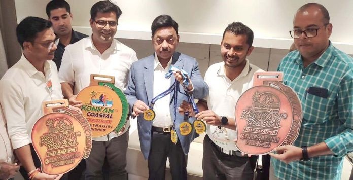 रत्नागिरी : सुवर्णसूर्य फाउंडेशन आयोजित कोकण कोस्टल मॅरेथॉनच्या पदकांचे अनावरण माजी मुख्यमंत्री, माजी केंद्रीय मंत्री व रत्नागिरी-सिंधुदुर्गचे विद्यमान खासदार नारायणराव राणे यांच्या हस्ते करण्यात आले.