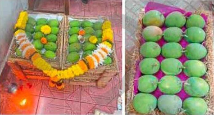 ऊन पडल्यामुळे मोहोराला फळधारणा झाली. त्याचे जतन करत १६ जानेवारीला १० डझन आंबा काढला. आंब्याच्या दोन पेट्या मुंबई, वाशी मार्केटमधील शैलेश नलावडे यांच्याकडे विक्रीसाठी पाठवल्या. शुक्रवारी त्या वाशी बाजारात पोहोचल्या. नलावडे यांच्या हस्ते पहिल्या पेटीची पूजा झाली.
