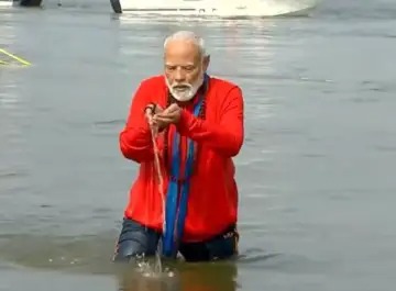 आज सकाळी दिल्लीहून विमानाने पंतप्रधान नरेंद्र मोदी हे प्रयागराज येथे पोहोचले. नियमितपणे कुर्ता पायजमा आणि जॅकेट परिधान करणारे नरेंद्र मोदी मोदी हे महाकुंभमेळ्यामध्ये थोड्या वेगळ्याच रूपात दिसले. यावेळी नरेंद्र मोदींसोबत उत्तर प्रदेशचे मुख्यमंत्री योगी आदित्यनाथ हेही उपस्थित होते. नरेंद्र मोदी हे निषादराज क्रूजमधून संगमाजवळ पोहोचले. तिथे गळ्यात केसरी उपरणं आणि हातात रुद्राक्षांच्या माळा परिधान करून त्यांनी त्रिवेणी संगमान स्नान केलं. यावेळी महाकुंभानिमित्त संगमतटावर आलेल्या लाखो भाविकांमध्ये पंतप्रधान नरेंद्र मोदी यांची एक झलक पाहण्यासाठी उत्सुकता दिसून येत होती.