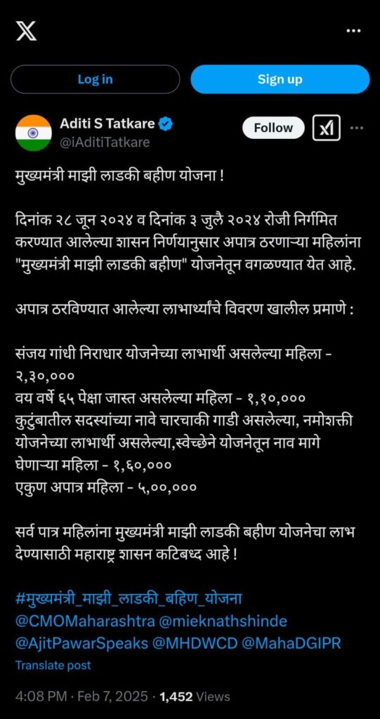सर्व पात्र महिलांना मुख्यमंत्री माझी लाडकी बहीण योजनेचा लाभ देण्यासाठी महाराष्ट्र शासन कटिबध्द आहे !’ असं ट्विट आदिती तटकरे यांनी केलं आहे.