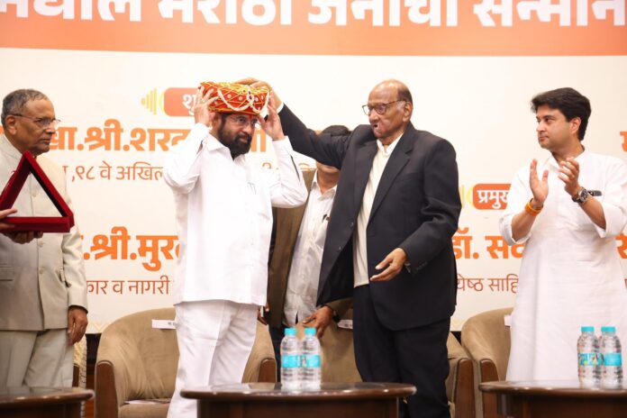 सरहदच्या वतीने उपमुख्यमंत्री एकनाथ शिंदे यांचा ‘महादजी शिंदे राष्ट्र गौरव’ पुरस्काराने गौरव करण्यात आला. राष्ट्रवादी काँग्रेसचेशरद पवार, उपमुख्यमंत्री एकनाथ शिंदे, केंद्रीय दूरसंचार मंत्री ज्योतिरादित्य सिंधिया, आयुष मंत्री प्रतापराव जाधव, पद्मविभूषण राम सुतार, ज्येष्ठ साहित्यिक सदानंद मोरे, सरहदचे संजय नाहर, दिल्ली मराठी प्रतिष्ठानचे वैभव डांगे आणि लेशपाल जवळगे आदी उपस्थित होते. पवार म्हणाले की, अलीकडच्या काळात नागरी प्रश्नांची जाण असणारा नेता म्हणून एकनाथ शिंदे यांची ओळख आहे.