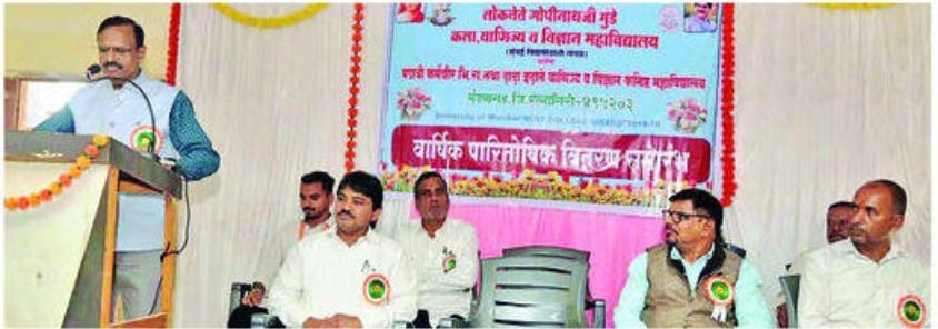 कार्यक्रमाच्या अध्यक्षस्थानी संस्थेचे सहकार्यवाह विश्वदास लोखंडे होते. कार्यक्रमास संस्थेचे कोषाध्यक्ष रवींद्रकुमार मिश्रा, सहकोषाध्यक्ष सुनीलभाई मेहता, डॉ. प्रभाकर पेंडसे, ज्योती रावेरकर, आबासाहेब हुलगे, महाविद्यालयाचे प्राचार्य डॉ. राहुल जाधव, उपप्राचार्य डॉ. वाल्मीक परहर आदी उपस्थित होते.