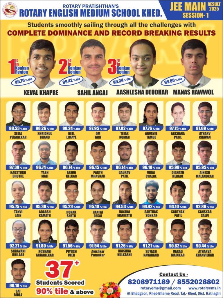 खेड : माहे जानेवारी 2025 मध्ये नॅशनल टेस्टिंग एजन्सी मार्फत घेण्यात आलेल्या जे. ई. ई. मेन्स या प्रथम फेरी प्रवेश परीक्षेचा निकाल नुकताच जाहीर झाला. यामध्ये रोटरी इंग्लिश मिडिअम स्कूल खेडमधील इयत्ता 12वीच्या विज्ञान शाखेतील विद्यार्थ्यांनी आपल्या पहिल्याच प्रयत्नात उत्तुंग भरारी घेतली आहे.