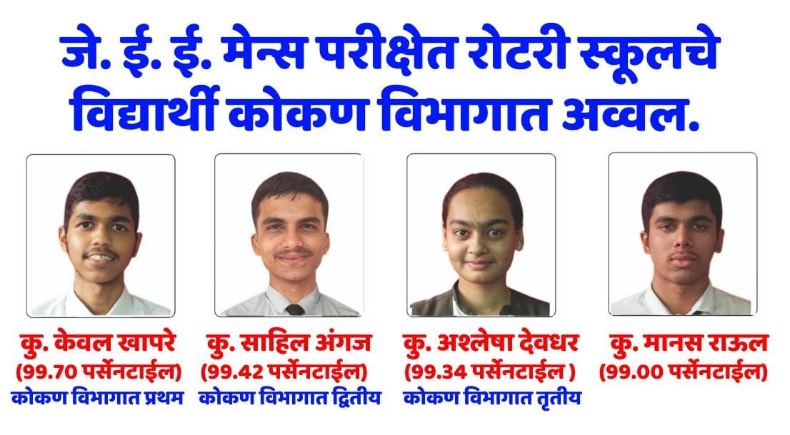जे.ई.ई. मेन्स परीक्षेतील यशस्वी विद्यार्थ्यांमध्ये कु. केवल खापरे (99.70 पर्सेनटाईल) गुण मिळवत कोकण विभागात प्रथम, कु. साहिल अंगज (99.42 पर्सेनटाईल) गुण मिळवत कोकण विभागात द्वितीय, कु. अश्लेषा देवधर (99.34 पर्सेनटाईल ) गुण मिळवत कोकण विभागात तृतीय, कु. मानस राऊल (99.00 पर्सेनटाईल) गुण प्राप्त केले. तसेच 7 विद्यार्थ्यांनी 98 पर्सेनटाईल पेक्षा अधिक गुण, 13 विद्यार्थ्यांनी 97 पर्सेनटाईल पेक्षा अधिक गुण, 18 विद्यार्थ्यांनी 96 पर्सेनटाईल पेक्षा अधिक गुण, 24 विद्यार्थ्यांनी 95 पर्सेनटाईलपेक्षा पेक्षा अधिक गुण व 37 पेक्षा अधिक विद्यार्थ्यांनी 90 पर्सेेनटाईलपेक्षा अधिक गुण प्राप्त करून रोटरी स्कूलच्या निरंतर यशस्वितेची परंपरा कायम राखली आहे. विद्यार्थ्यांनी प्राप्त केलेल्या यशामुळे सर्वच स्तरांतून त्यांच्यावर कौतुकाचा वर्षाव होत आहे.