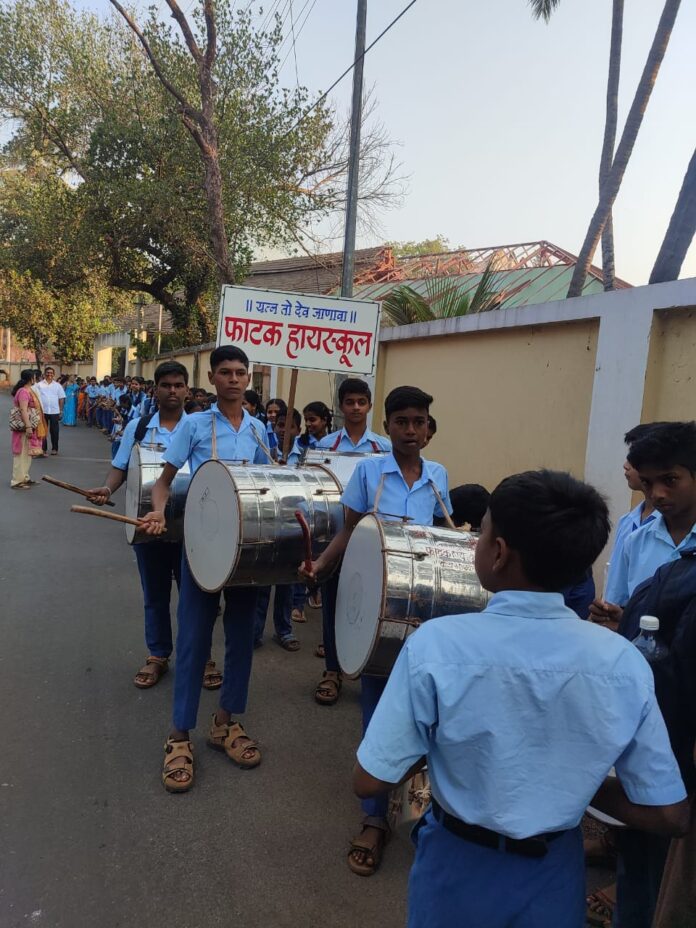 रत्नागिरी : मराठी भाषा गौरव दिनानिमित्त काढलेल्या ग्रंथ दिंडीमध्ये फाटक हायस्कूल रत्नागिरीचे लेझीम पथक लक्षवेधी ठरले.