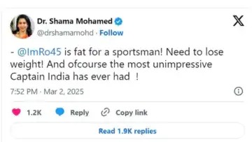 सोशल मीडियावर हा वाद सुरू झाला. चॅम्पियन्स ट्रॉफीमध्ये न्यूझीलंडविरुद्ध भारताच्या शानदार विजयानंतर काँग्रेस प्रवक्त्या शमा मोहम्मद यांनी भारतीय क्रिकेट संघाचा कर्णधार रोहित शर्माच्या फिटनेस आणि कर्णधारपदावर प्रश्नचिन्ह उपस्थित केले. त्याने सोशल मीडिया प्लॅटफॉर्म X वर लिहिले – रोहित शर्मा जाड्या खेळाडू, वजन कमी करण्याची गरज आहे.