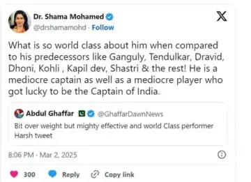शमा मोहम्मदने रोहित शर्माची तुलना माजी भारतीय क्रिकेट दिग्गजांशी केली. त्यांनी X वर लिहिले, ‘सौरव गांगुली, सचिन तेंडुलकर, राहुल द्रविड, महेंद्रसिंग धोनी, विराट कोहली, कपिल देव आणि रवी शास्त्री यांसारख्या दिग्गजांच्या तुलनेत रोहित शर्मामध्ये इतके जागतिक दर्जाचे काय आहे?’ तो एक सरासरी खेळाडू आणि कर्णधार आहे, पण नशिबाने तो भारतीय संघाचा कर्णधारपद बनला.