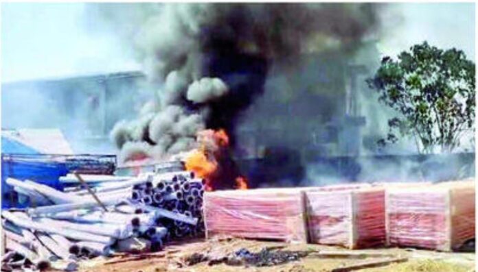 खेड : तालुक्यातील लोटे औद्योगिक वसाहतीमधील आल्ड्रफ केमिकल च्या नावे असलेल्या बंद प्लॉटमध्ये रविवार ९ रोजी दुपारी दोन वाजता आग लागली. यावेळी हिंदुस्तान युनिलिव्हर कंपनीचे लाखो रुपयांचे साहित्य जळून खाक झाल्याची घटना घडली.