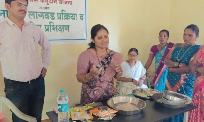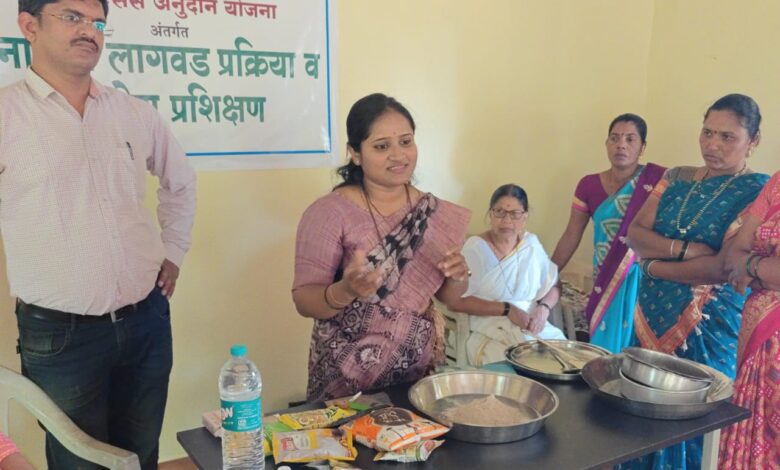 प्रशिक्षणात नाचणी लागवड, प्रक्रिया व उद्योग याविषयावर तसेच व्यावसायिकदृष्ट्या नाचणीपासून बनणारे पदार्थ व त्यावर आधारित लघुउद्योगाच्या संधी यावर शरदचंद्रजी पवार अन्नतंत्रद्यान महाविद्यालय खरवते-दहिवली येथील प्राध्यापक सौ. विचारे मॅडम यांनी शेतकऱ्यांना व बचतगटांना मार्गदर्शन केले.