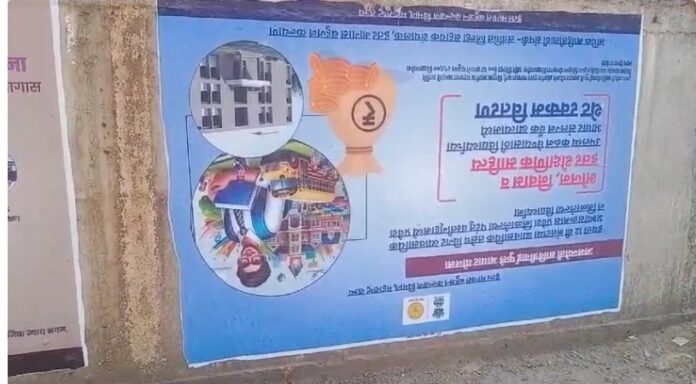 चिपळूण : महाराष्ट्र शासनाच्या विविध योजनेचे बॅनर पंचायत समिती जवळील भिंगार्डे कॉम्प्लेक्सच्या संरक्षण भिंतीवर लावण्यात आले आहेत. हे बॅनर गेले १/२ महिन्यापासून जनतेच्या निदर्शनास आणण्यासाठी प्रसिद्ध केलेले आहेत. सदरचे बॅनर वरील माहिती उलटी लावून राजमुद्रा देखील उलट्या लावलेल्या आहेत. ही राजमुद्रा उलट्या पद्धतीने लावणाऱ्या संबंधितांवर कारवाई करण्याची मागणी छावा मराठा योद्धा संघटना संपर्कप्रमुख नयमेश दळी यांनी जिल्हाधिकाऱ्यांकडे यांच्याकडे केली आहे.