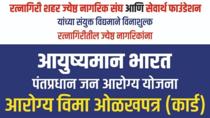 रत्नागिरी, दि. २६ मार्च २०२५ : रत्नागिरी शहरातील ज्येष्ठ नागरिकांना आयुष्यमान भारत पंतप्रधान जन आरोग्य योजनेअंतर्गत आरोग्य विमा ओळखपत्र (कार्ड) विनामूल्य उपलब्ध करून देण्यासाठी रत्नागिरी शहर ज्येष्ठ नागरिक संघ आणि सेवार्थ फाउंडेशन यांच्या संयुक्त विद्यमाने विशेष कार्यक्रमाचे आयोजन करण्यात आले आहे. हा कार्यक्रम शुक्रवार, दि. २८ मार्च २०२५ रोजी सकाळी १०:३० ते दुपारी १:३० या वेळेत ज्येष्ठ नागरिक संघाच्या शिवाजीनगर येथील सभागृहात (नाना-नानी पार्क शेजारी) होणार आहे.