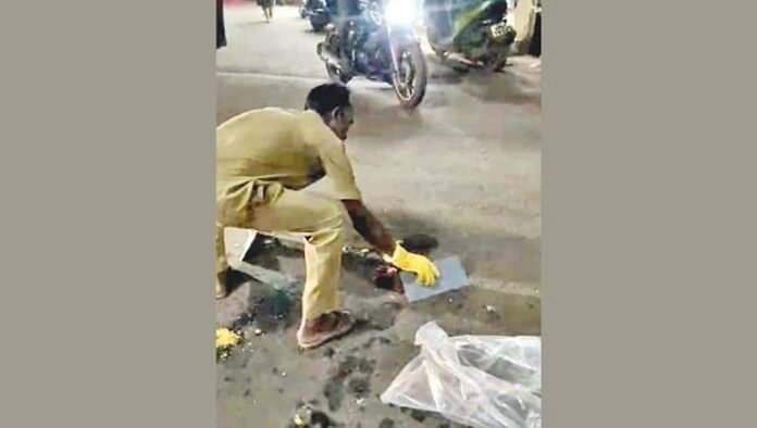 अर्धा कचरा गाडीत तर अर्धा कचरा रस्त्यावर अशी स्थिती दिसून येत आहे. रस्त्यावर पडलेल्या ओला कचरा पुन्हा नगर परिषद कर्मचाऱ्यांमार्फत गोळा करावा लागत आहे. म्हणजेच एक काम दोन वेळा करण्याचे काम या कर्मचाऱ्यांना करावे लागत आहे. या परिसरातील हॉटेल, भाजी, फळ व्यावसायिकांचा यांचा बहुतांश ओला कचरा रात्रीच्यावेळी या घंटागाडीत व्यापाऱ्यांकडून दिला जातो. मात्र, गेल्या काही दिवसांपासून गळक्या, भंगार घंटागाडीतून ओल्या कचऱ्याचे लगदे गाडीतील फाटक्या पत्र्यातून रस्त्यावर गळून पडताना दिसून येत आहेत.