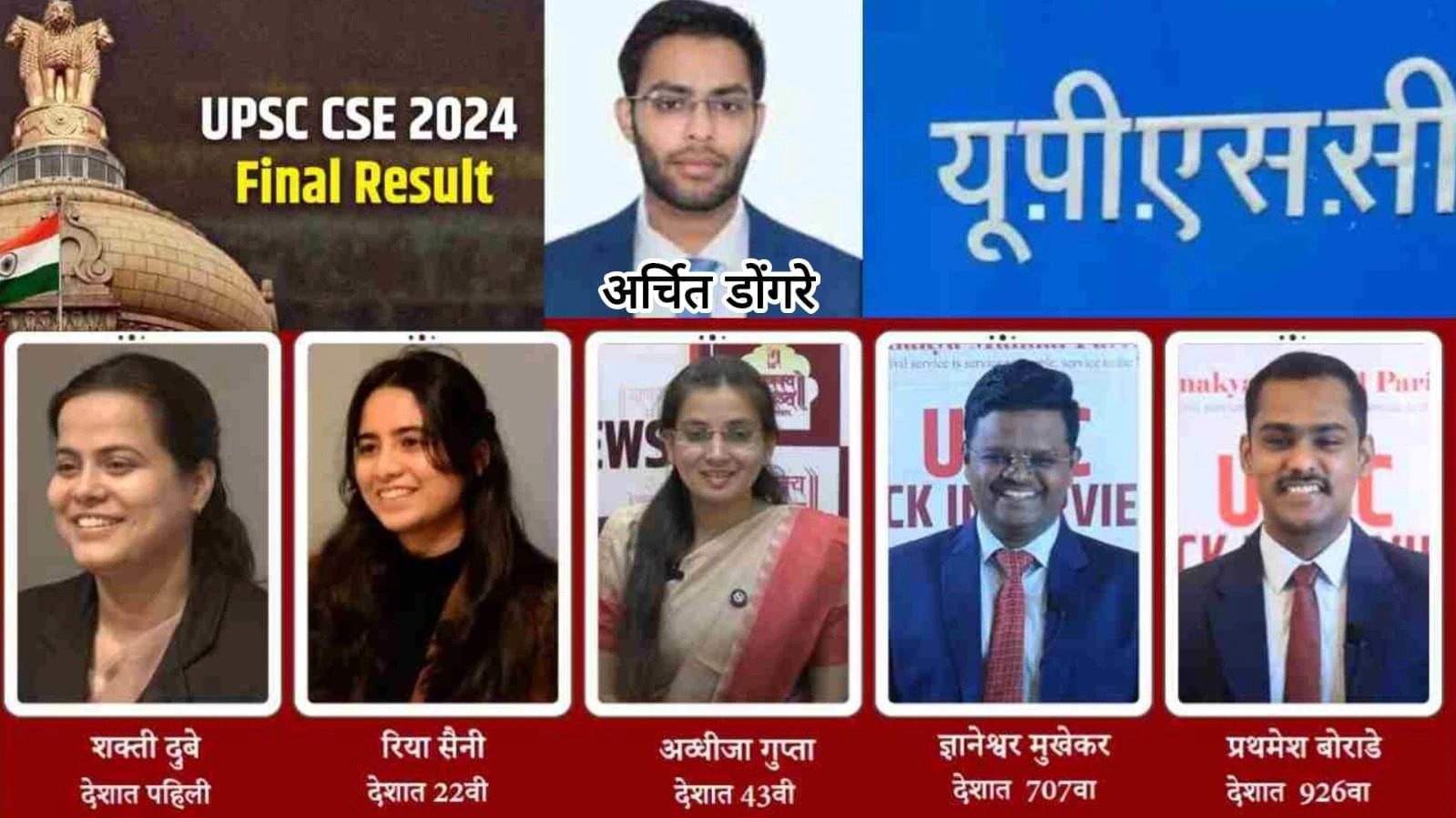 मुंबई : युपीएससीच्या ( केंद्रीय लोकसेवा आयोग 2024 ) नागरी सेवा परीक्षाचा अंतिम निकाल मंगळवार अखेर जाहीर झाला आहे. देशभरातून एकूण 1009 उमेदवार या परीक्षेत यशस्वी झाले आहेत. या परीक्षेत शक्ती दुबे पहिल्या आहेत तर दुसरा क्रमांक हर्षिता गोयल तर महाराष्ट्रातील अर्चित पराग डोंगरे हा तिसऱ्या क्रमांकावर उत्तीर्ण आला आहे. महाराष्ट्रातून 90 हून अधिक उमदेवारांनी घवघवीत यश मिळविले आहे.अर्चित पराग डोंगरे राज्यातून प्रथम आले असून देशात 3 रा क्रमांक पटकाविला आहे.