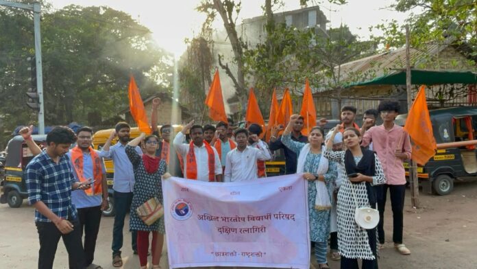 रत्नागिरी : अखिल भारतीय विद्यार्थी परिषदेच्या दक्षिण रत्नागिरी जिल्हा विभागातर्फे २२ एप्रिल रोजी जम्मू-काश्मीरमधील पहलगाम येथे आतंकवाद्यांनी केलेल्या भ्याड हल्ल्यात निर्दयतेने मारले गेलेल्या हिंदू पर्यटकांना श्रद्धांजली अर्पण करण्यात आली.