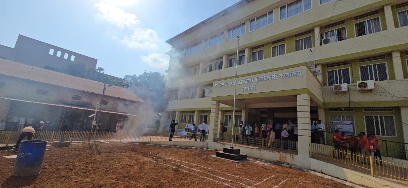 बुधवारी दुपारी ठिक 4 वाजता रत्नागिरी तहसील कार्यालयात बॉम्ब पडल्याचा दूरध्वनी संदेश पोलीस, जिल्हा आपत्ती नियंत्रण कक्ष यांना देण्यात आला. तहसिलदार कार्यालय इमारतीच्या पहिल्या मजल्यावर धुराचे लोट बाहेर पडत होते. यावेळी सायरन वाजविण्यात आला. याचवेळी या इमारतीसमोरही दोन बाँब फुटले. ही आपत्कालीन परिस्थिती लक्षात घेऊन, एनसीसी पथक, पोलीस दल, शीघ्र कृती दलाचे जवान, आपती व्यवस्थापन विभाग, आपदा मित्र नागरी संरक्षण दल स्वयंसेवक, स्वयंसेवी संस्था यांनी घटनास्थळी धाव घेतली. यामध्ये जखमी झालेल्या कर्मचाऱ्यांना जवानांनी बाहेर काढत रुग्णवाहिकेमध्ये दाखल केले. त्याचबरोबर अन्य कर्मचारी, अधिकारी, कामानिमित्त आलेल्या अभ्यागत नागरिकांना बाहेर काढून सुरक्षित स्थळी आणले.
