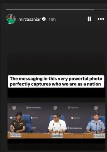 ऑपरेशन सिंदूरबाबत (Operation Sindoor) सोफिया कुरेशी आणि विंग कमांडर व्योमिका सिंग यांनी परराष्ट्र सचिव विक्रम मिस्री यांच्यासमवेत ‘ऑपरेशन सिंदूर’ (OperationSindoor) विषयी माहिती दिली होती. सानिया मिर्झा (SaniaMirza) हिने दोन महिला अधिकाऱ्यांचा पत्रकार परिषद घेतानाचा फोटो शेअर केलाय. सानिया मिर्झा (Sania Mirza) हिने या पोस्टला शेअर करून महिला अधिकाऱ्यांच्या योगदानाचे समर्थन केले. सानिया म्हणाली, हा फोटो परफेक्ट आहे, आपण देश म्हणून काय आहोत हे दाखवणारा आहे..